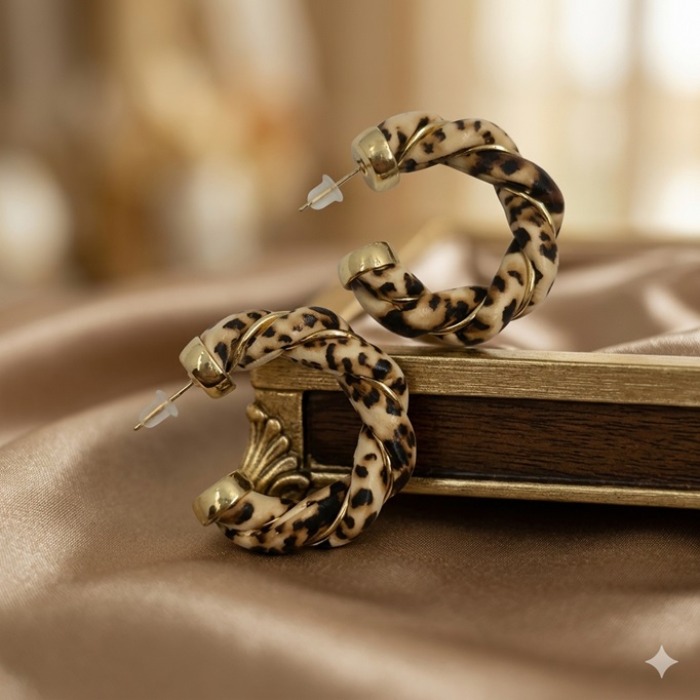 - Tasarım: Pürüzsüz yüzeyli, "statement" (iddialı) boyutta büyük halka formu. Halkanın dış yüzeyi, metalik parıltıyı dengeleyen canlı ve detaylı leopar desenleri ile bezelidir. Bu kontrast, küpeye derinlik ve hareket kazandırır.